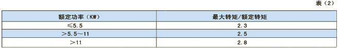 1.8、基準工作制時,YZR系列電動機在額定電壓下的較大轉矩對額定轉矩之比的保證值見表2